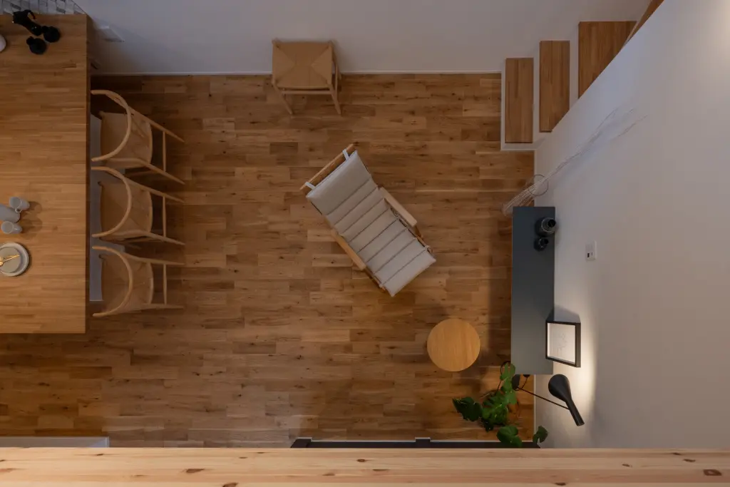 吹き抜けが縦方向への視線の抜けをつくり、開放感を生み出します。