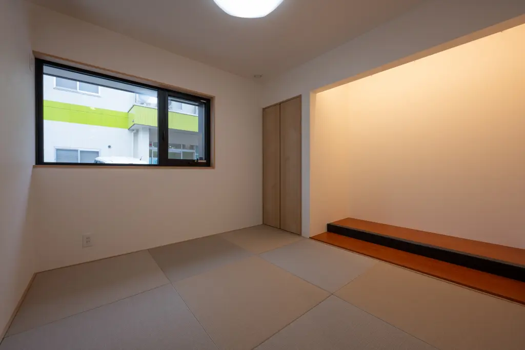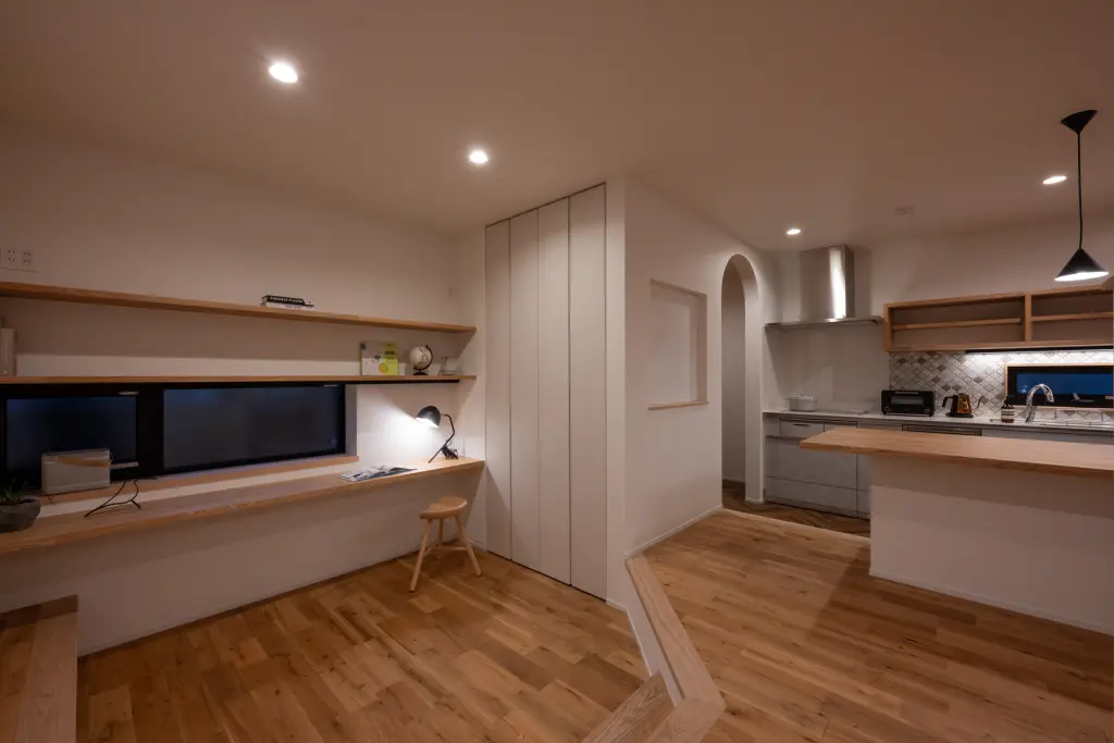 リビングに設けた段差のある小さなスペースは、お子さまたちのお気に入りの場所です。少し低い位置から見上げる天井は、いつもより高く感じられます。本を読んだり、おもちゃを広げたり、自分だけの時間を過ごせる特別な居場所。親の目が届く距離にありながら、程よい独立感が子どもの成長を見守ります。