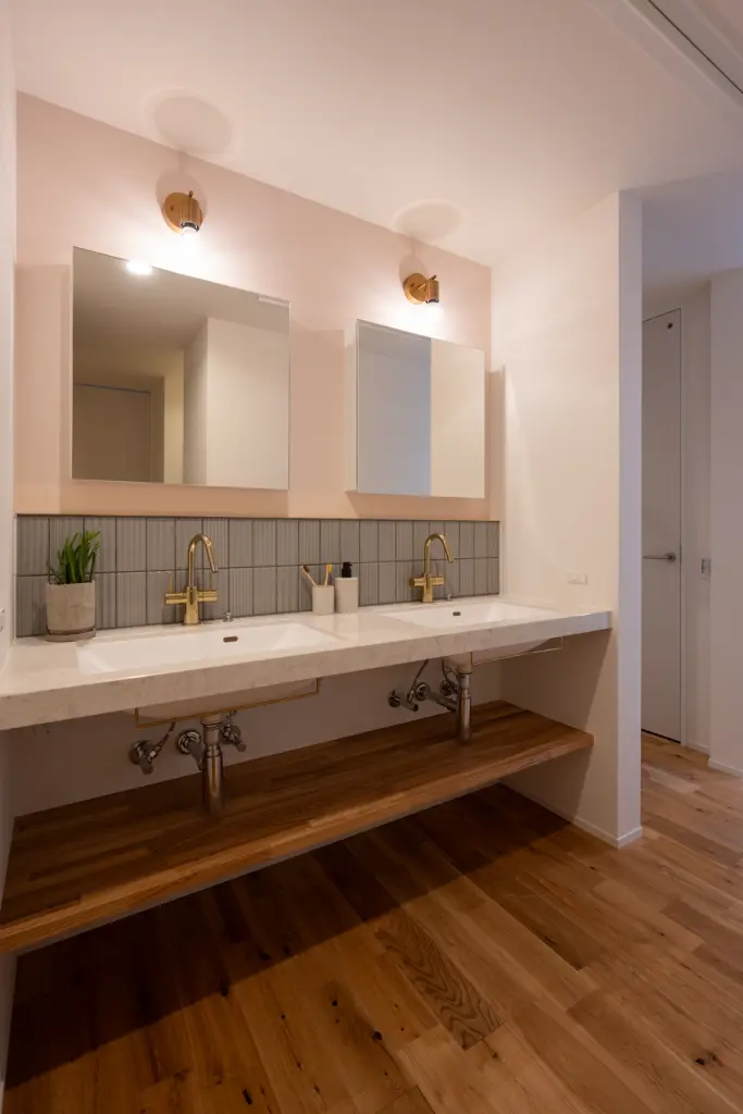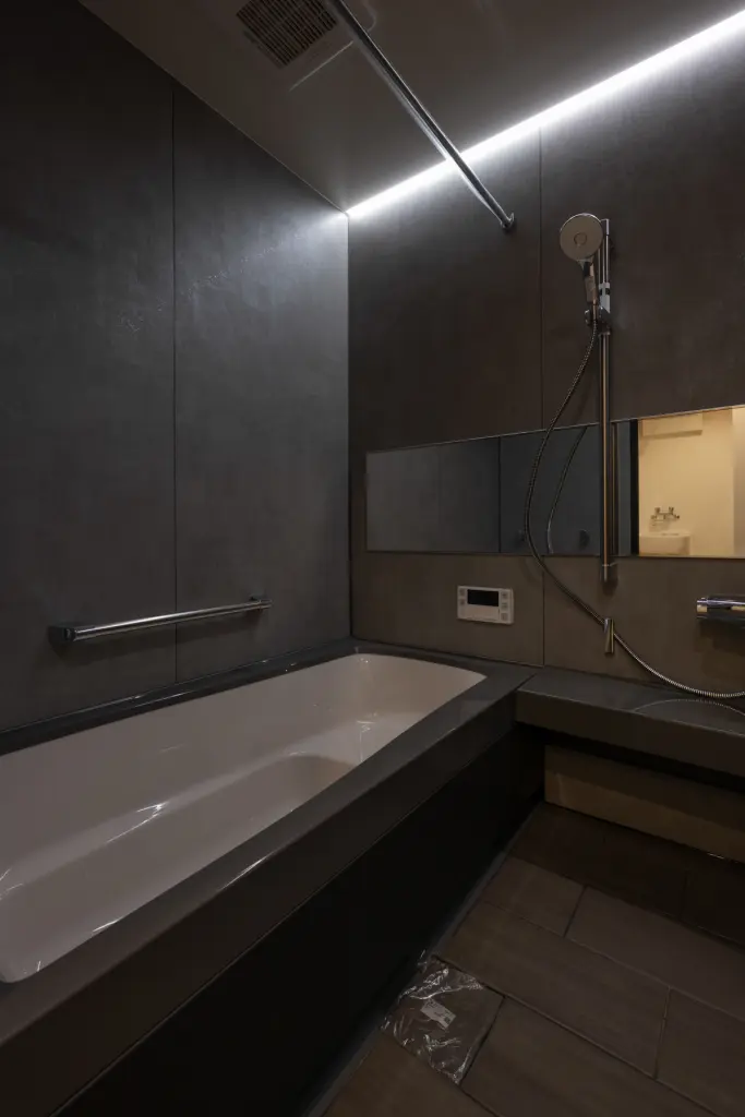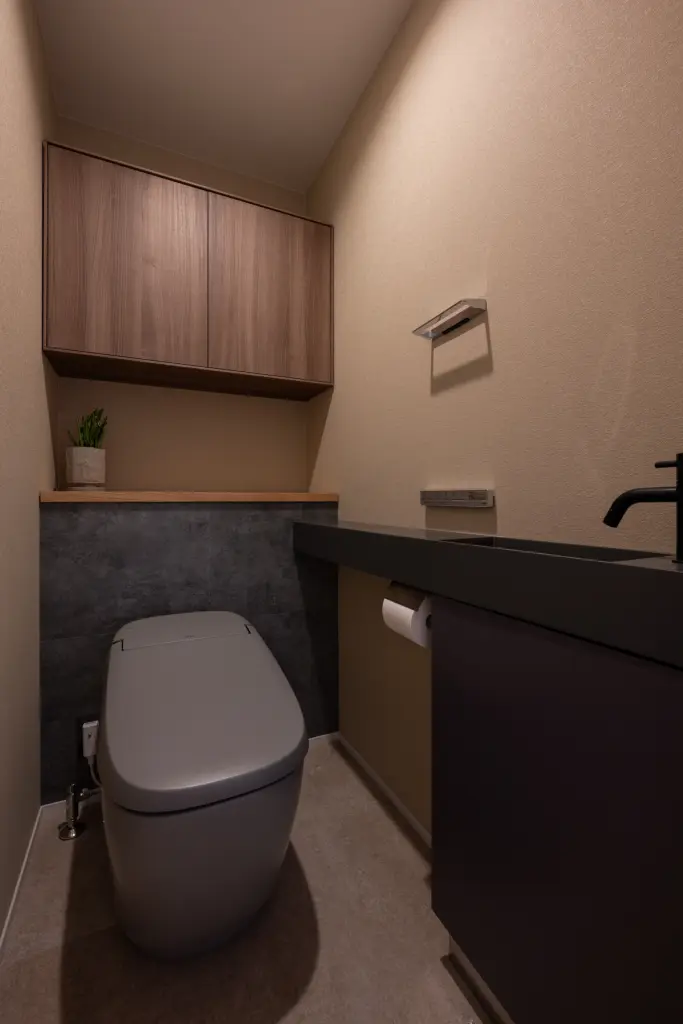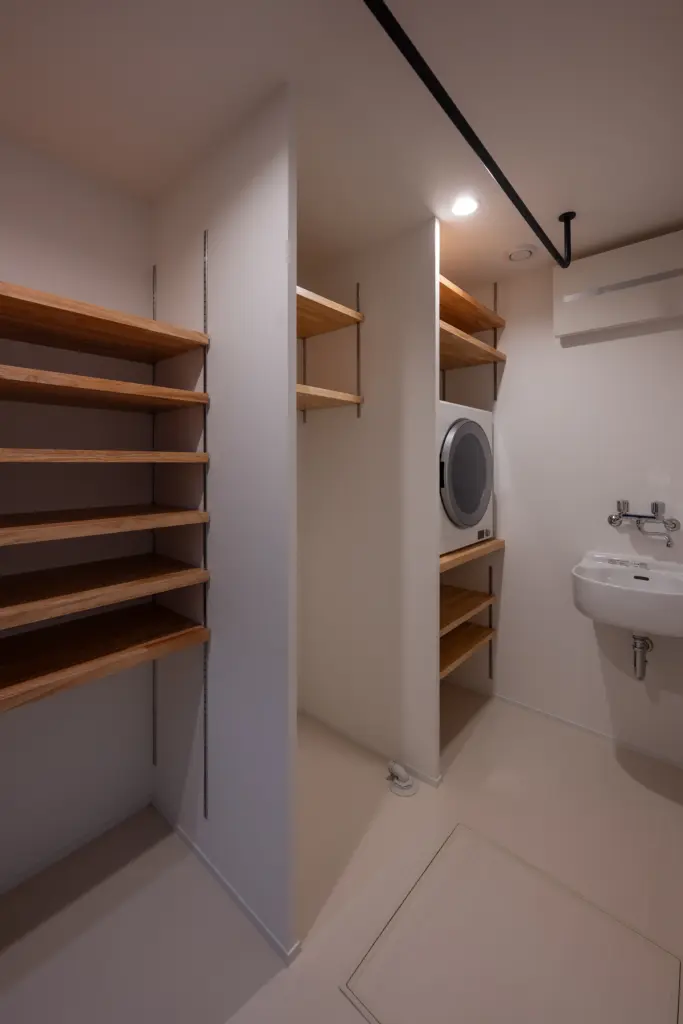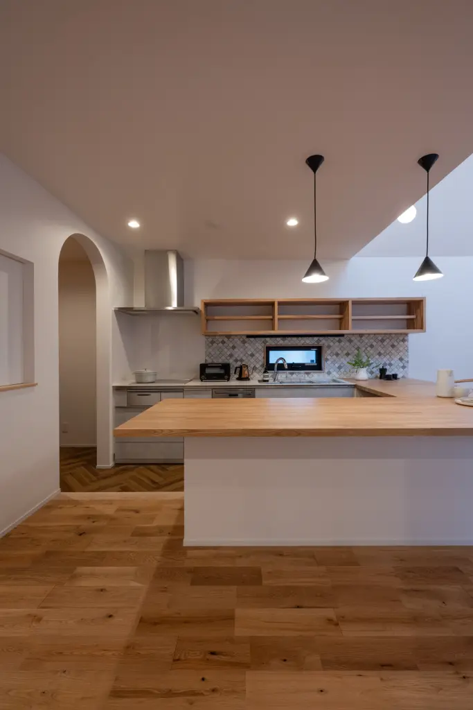 ユーティリティーから続く中庭には、木のぬくもりを感じるデッキが広がります。洗濯物を干しながら、季節の移ろいを肌で感じる朝。夕暮れ時には、デッキに腰掛けて家族で過ごす穏やかな時間。室内にいながら外の気配を感じ、外にいながら家のあたたかみを感じる。そんな曖昧な境界が、暮らしに豊かな奥行きをもたらしています。