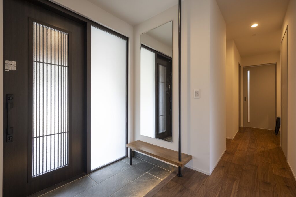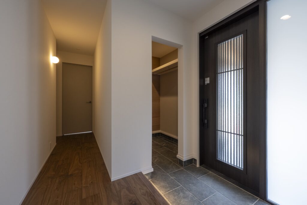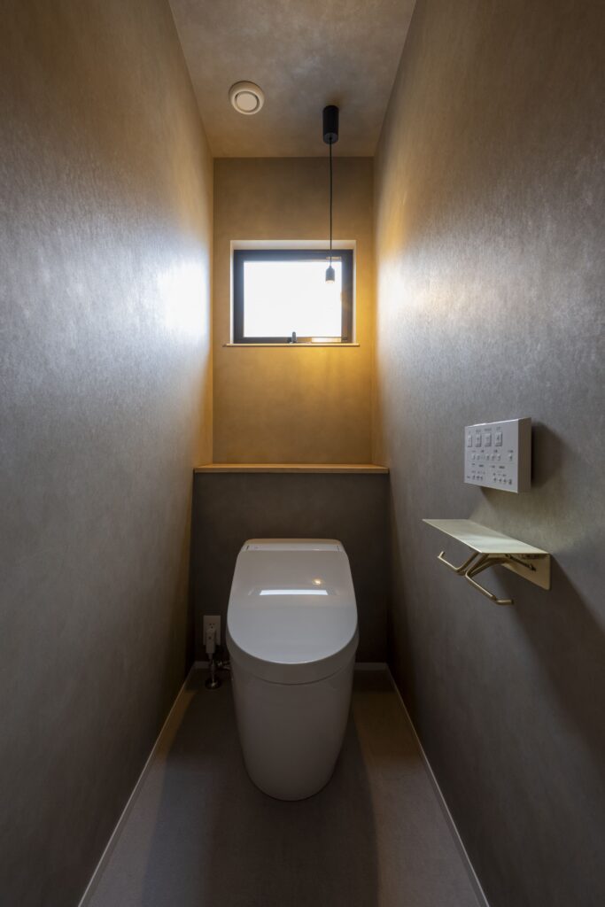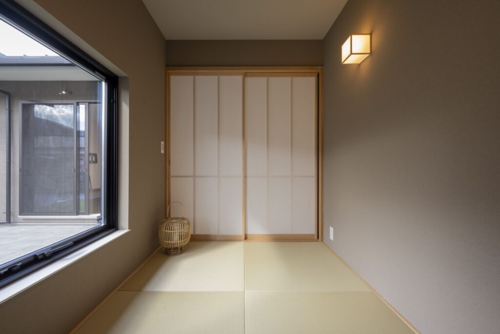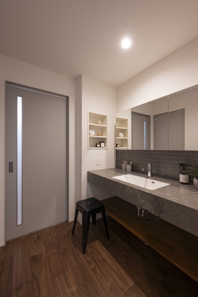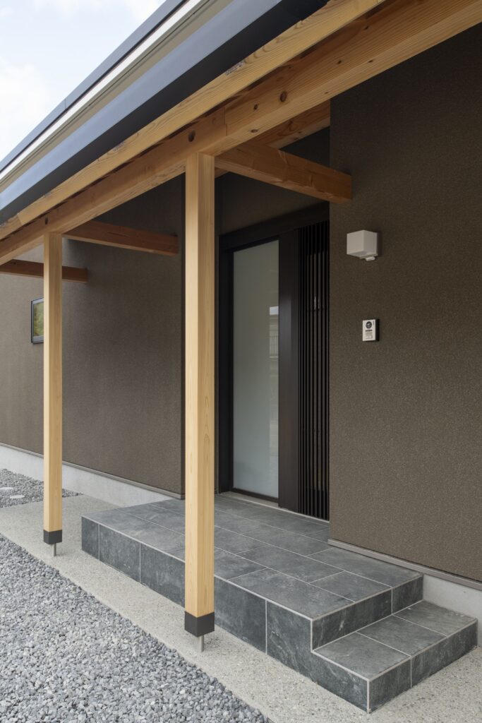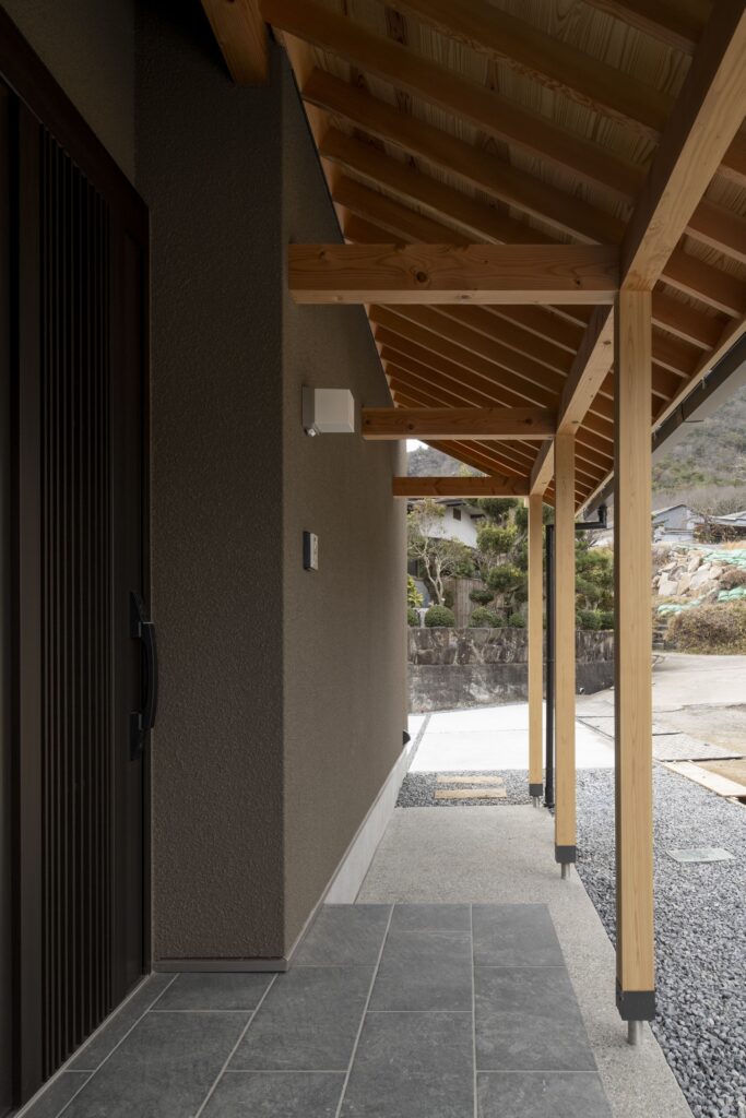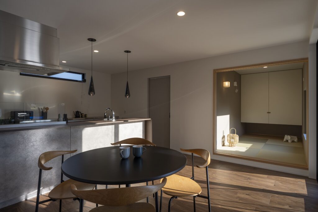 アプローチには屋根付きの回廊と露地行灯を配し、訪れる人をやわらかく迎え入れる雰囲気を演出している。L字型の建物はタイルテラスを設けた中庭を包み込むように配置され、室内と屋外が自然に連続する構成とした。中庭はLDKと一体的に使えるため、 住まい全体に豊かな広がりとつながりが生まれている。室内動線は、キッチンを中心に家事が軽やかに行える回遊動線とし、日常の暮らしやすさにも配慮した。