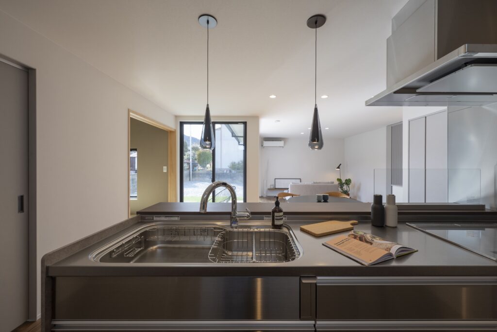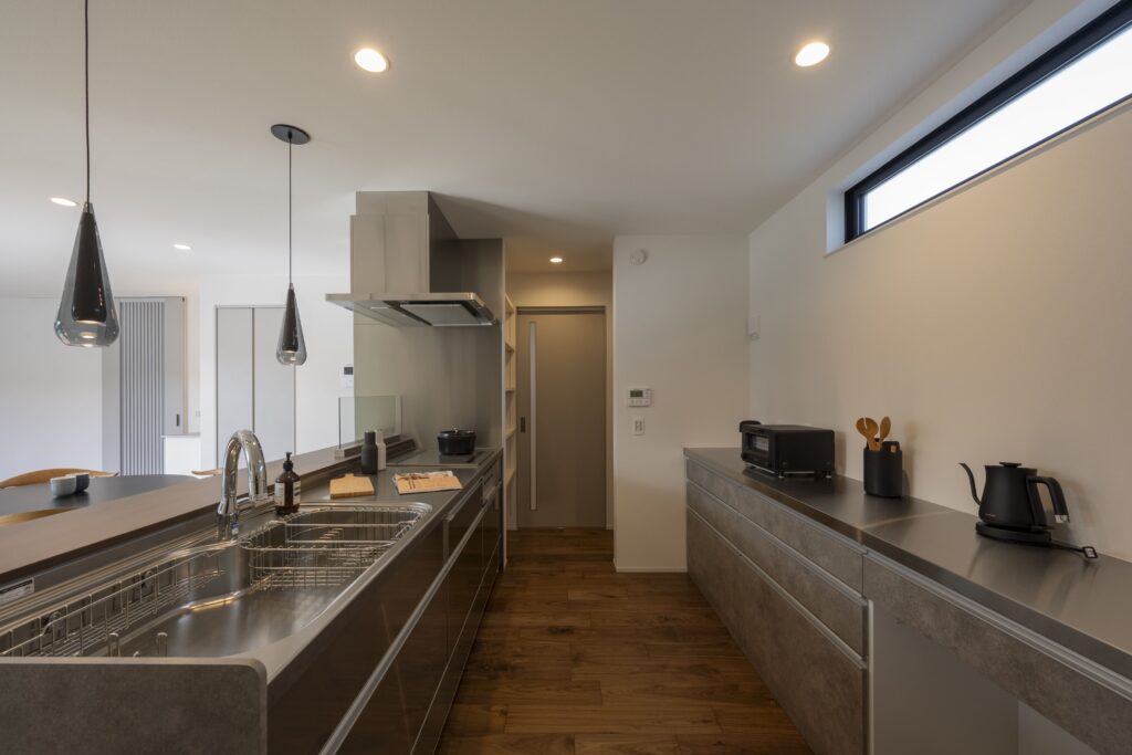 室内動線は、キッチンを中心に家事が軽やかに行える回遊動線とし、日常の暮らしやすさにも配慮した。
